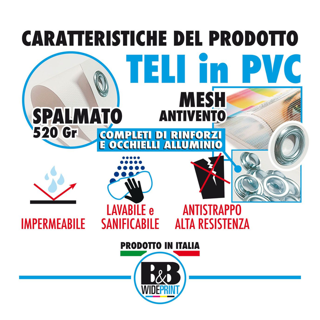 Telo PVC 510 gr a colori completo di termosaldature rinforzate e occhielli sul perimetro.